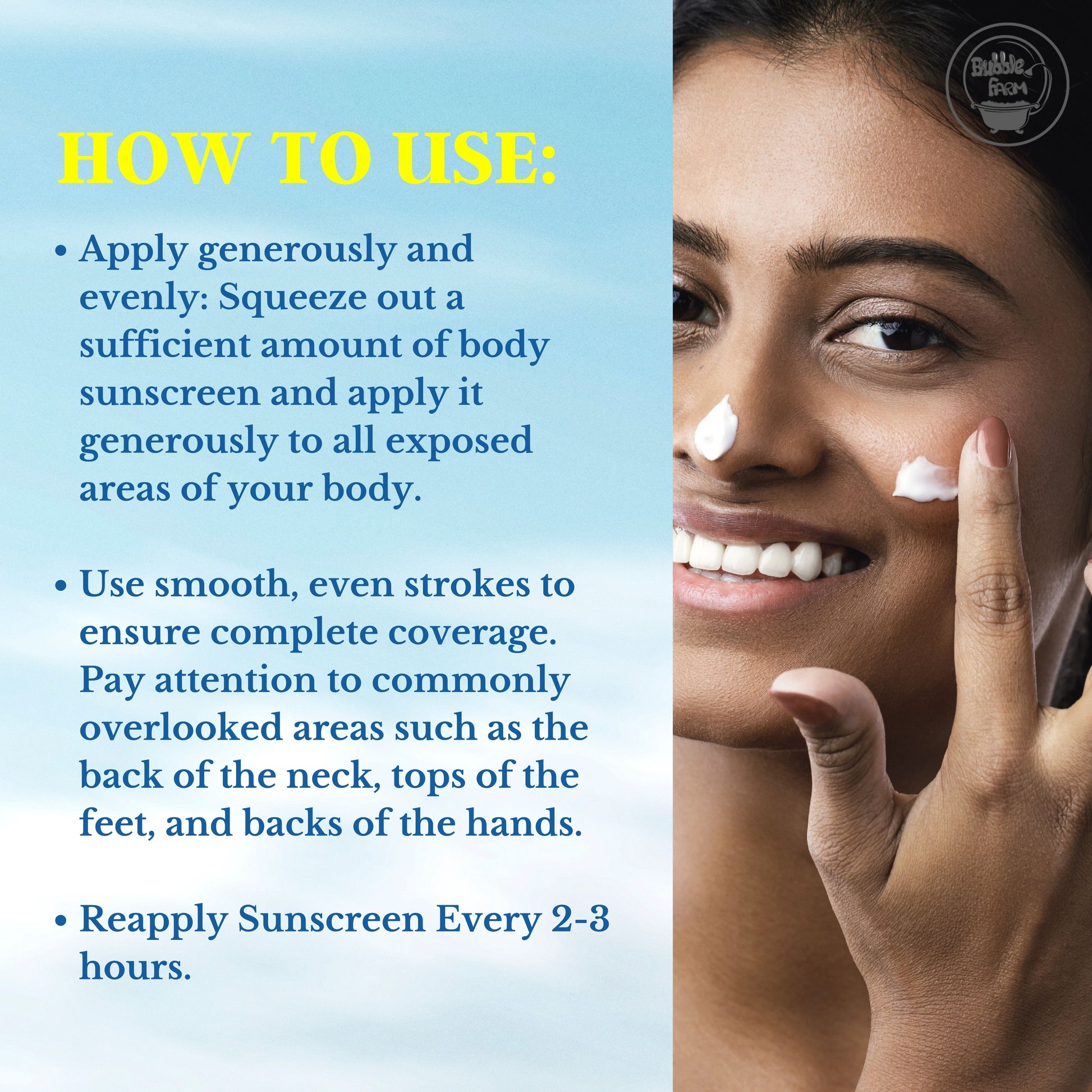 Apply generously and evenly: Squeeze out a sufficient amount of body sunscreen and apply it generously to all exposed areas of your body.